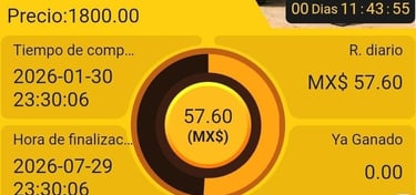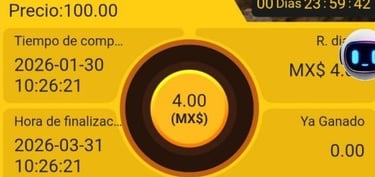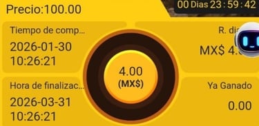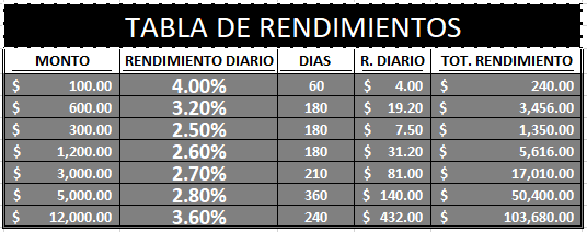 Únete a nuestro grupo y comienza a ganar hasta un 4% diario con inversiones desde $100, y puedes retirarlas el mismo día en retitos mínimos de $50 en horarios de inversión de Lunes a Viernes de 10am a 5pm, en la tabla aquí presentada se muestran las diferentes inversiones y los porcentajes de ganancia en pesos que van desde el 2.4% hasta el 5% de rendimiento diario, los montos, todas las inversiones tienen un periodo de ganancia que va de los 60 hasta los 360 días como máximo, al finalizar el periodo de ganancia la inversión inicial retornara de manera integra a tu cuenta afiliada, en ningún momento deberá de realizarse depósitos a cuentas de particulares o similares.